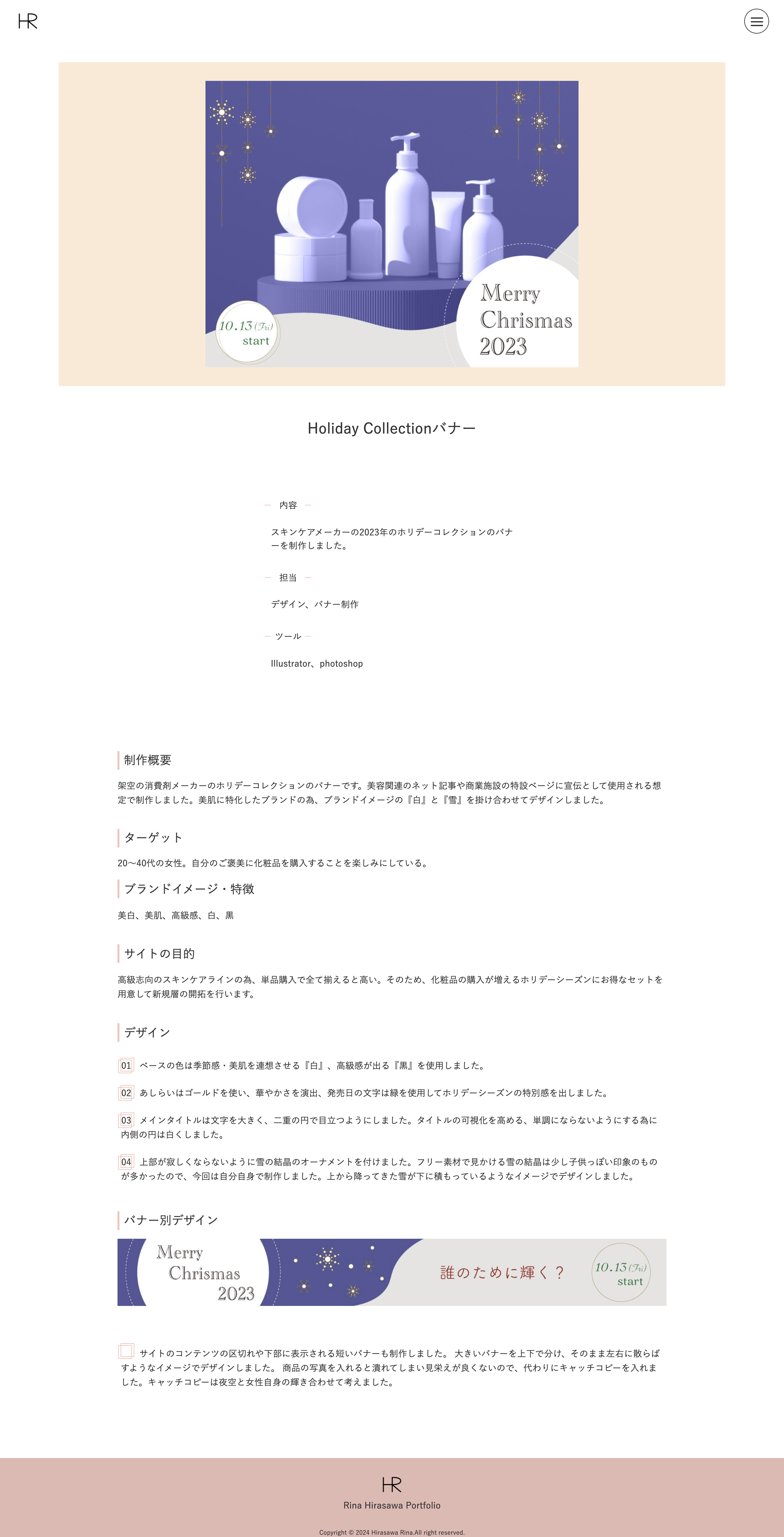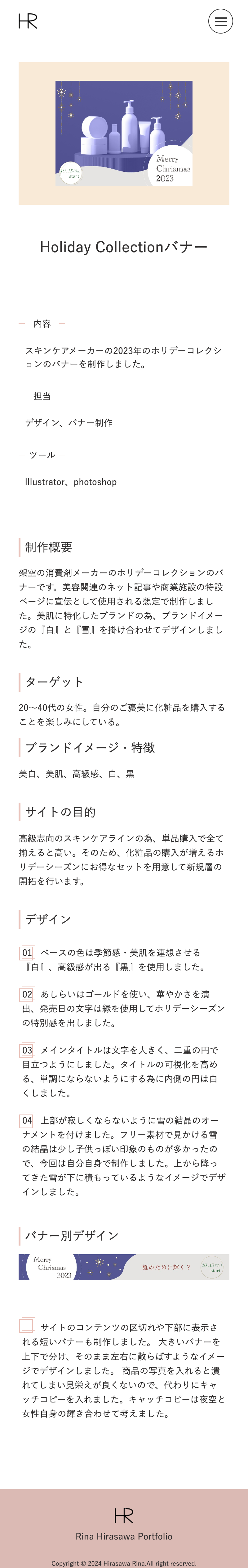 - 02作品数が少ない為、ポートフォリオも1つの作品として作りました。制作物のページは詳細がわかりやすいようにシンプルなレイアウトにし、使用する色は単色にしました。TopページやAbouページは、アニメーションやあしらいを多めに実装し、飽きないデザインを意識しました。